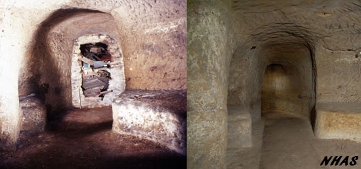 The Horse Shoe Cave is entered via a rock-cut arch leading from the Square Cave. The arch once contained a door and the post holes for the door frame are still visible. The cave’s domed shape is intended to give it great strength and ensures that water flows down the walls and away instead of dripping into the cave itself. There are large stone thralls (benches) around the walls which were intended to support barrels at a height which allowed their contents to be easily emptied into a container placed below them.